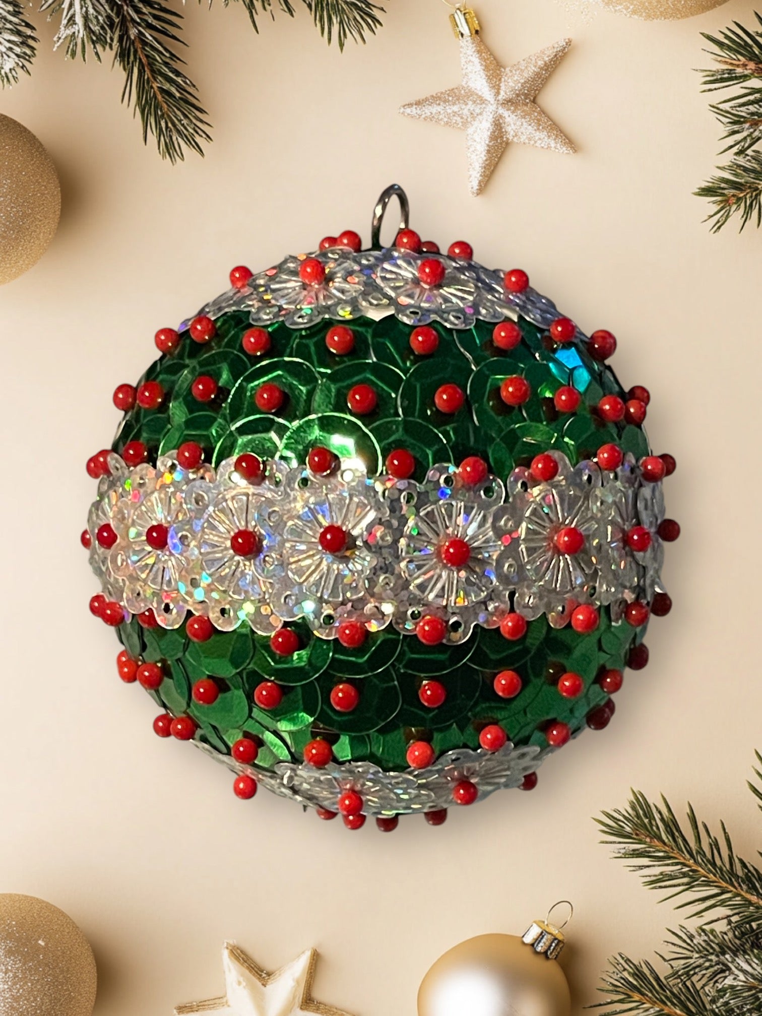 Green and holographic silver sequin ornament with red pins 2.5”