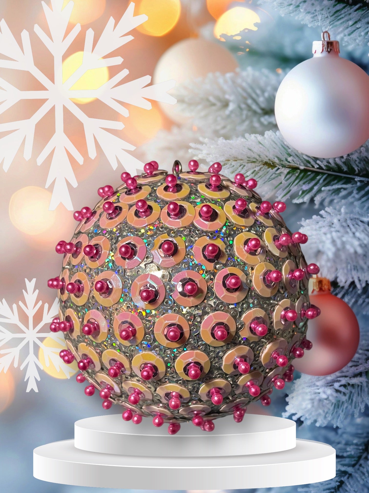 Iridescent and holographic ornament with hot pink pins 4.5”