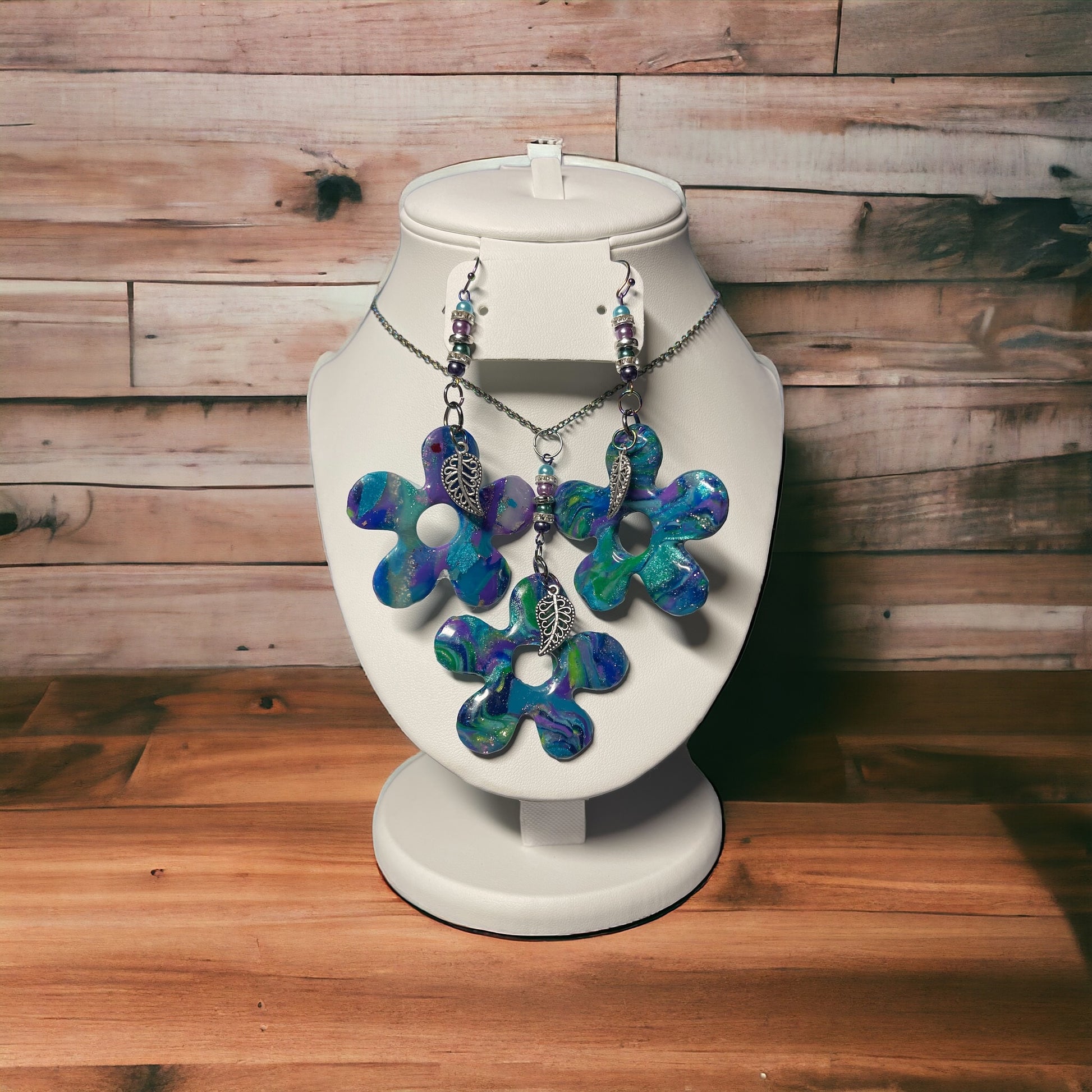 Your favorite peacock feather colors 5 petal flower pendant in polymer clay and glass beads paired with silver tone chain 24” and ball end wire dangle earrings with matching 5 petal dangles with filigree leaf charms
