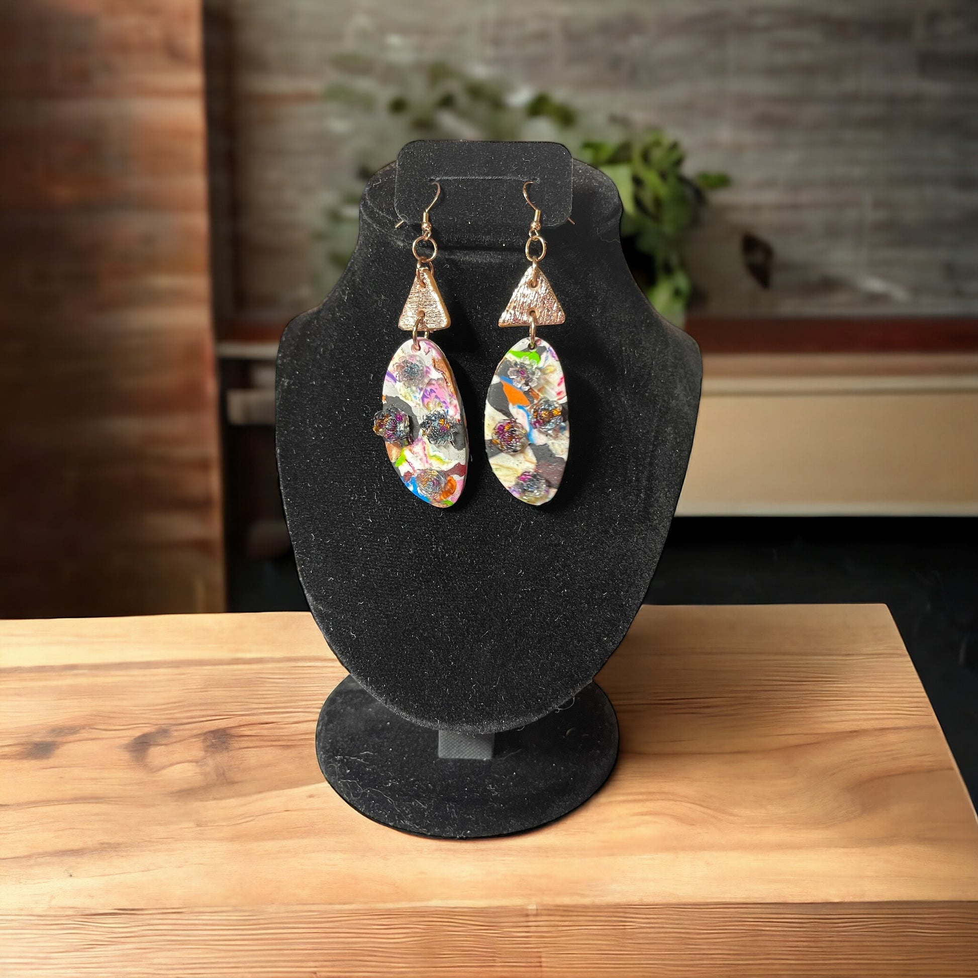 Polymer clay dangle with matching epoxy flower and golden triangle on kc gold ball end earring wires