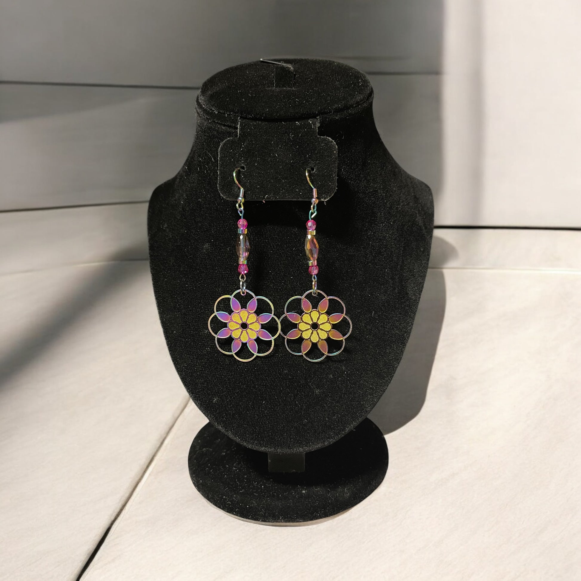 Rainbow chrome tone flower charm with matching wire dangle earring and faceted glass beads