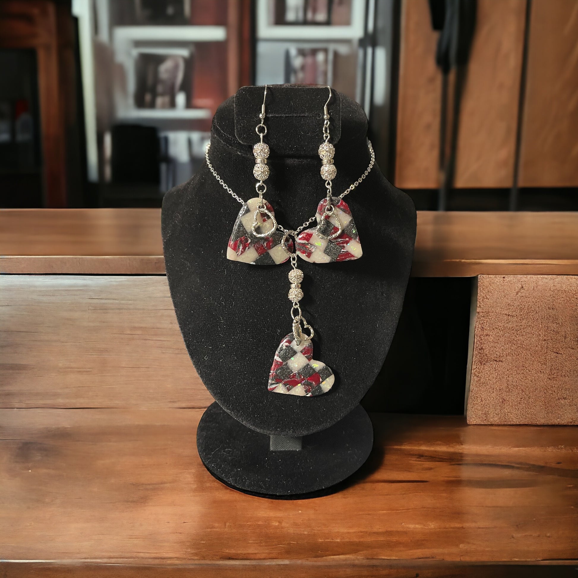 Opalescent, black shimmer and bordeaux hearts with silver tone hammered heart dangles on 24”rolo silver tone chain