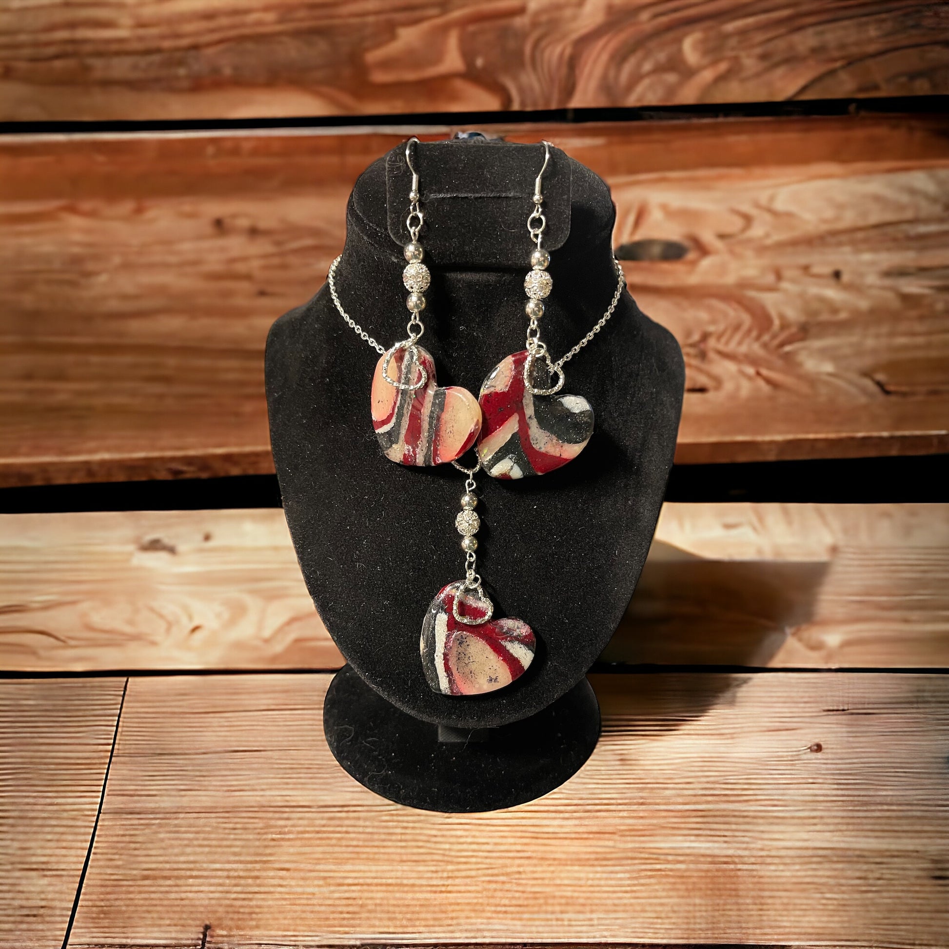 Opalescent, black shimmer and bordeaux hearts with silver tone hammered heart dangles on 24”rolo silver tone chain