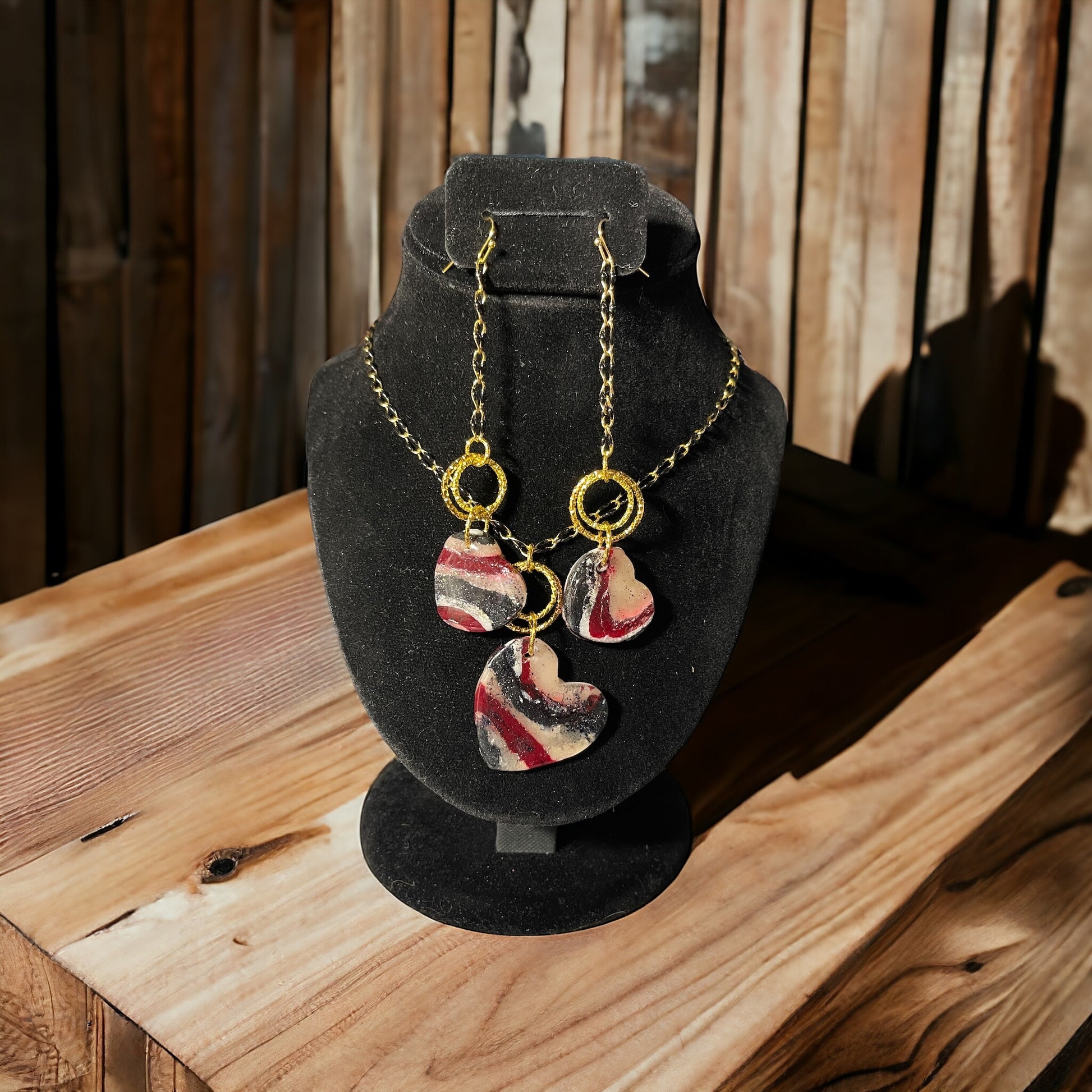 Opalescent, black shimmer and bordeaux polymer clay hearts with silver or gold tone hammered circle dangles on 24” silver  rolo or gold oils drip tone chain