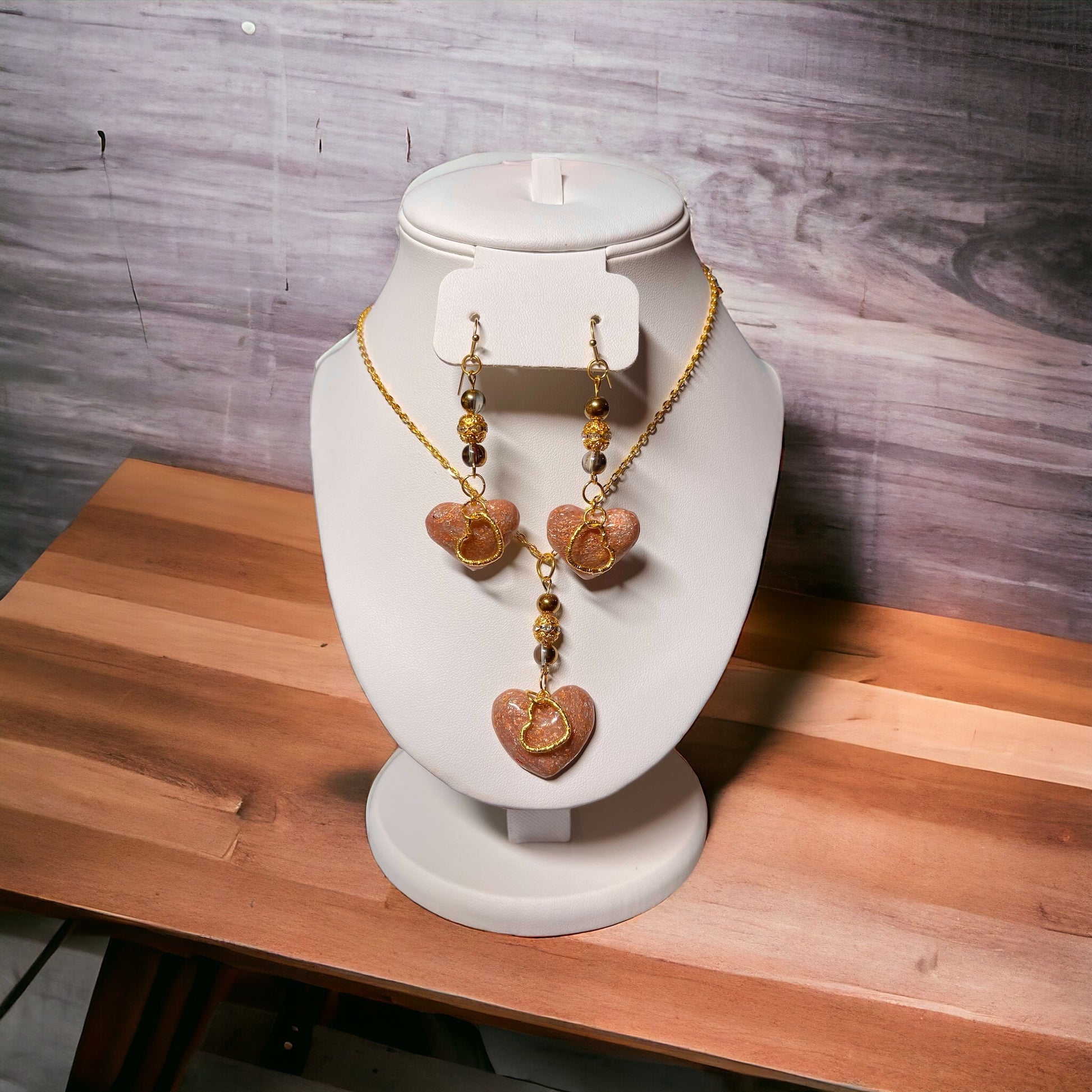 Rose granite pattern pendant and dangle earrings with 24” yellow gold tone heart link chain, earring findings and beads