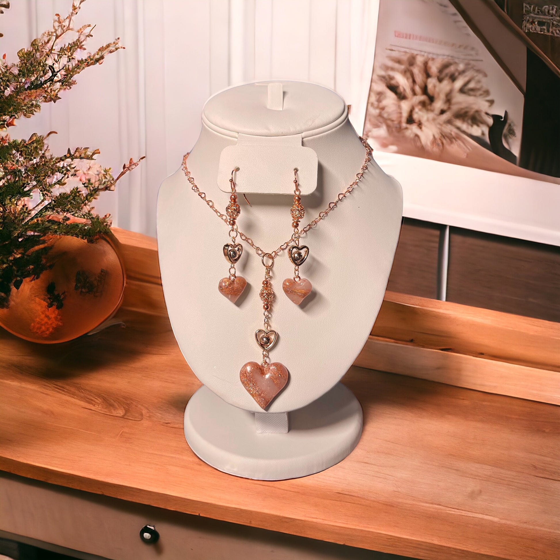 Rose granite pattern pendant and dangle earrings with 24” rose gold tone heart link chain, earring findings and beads