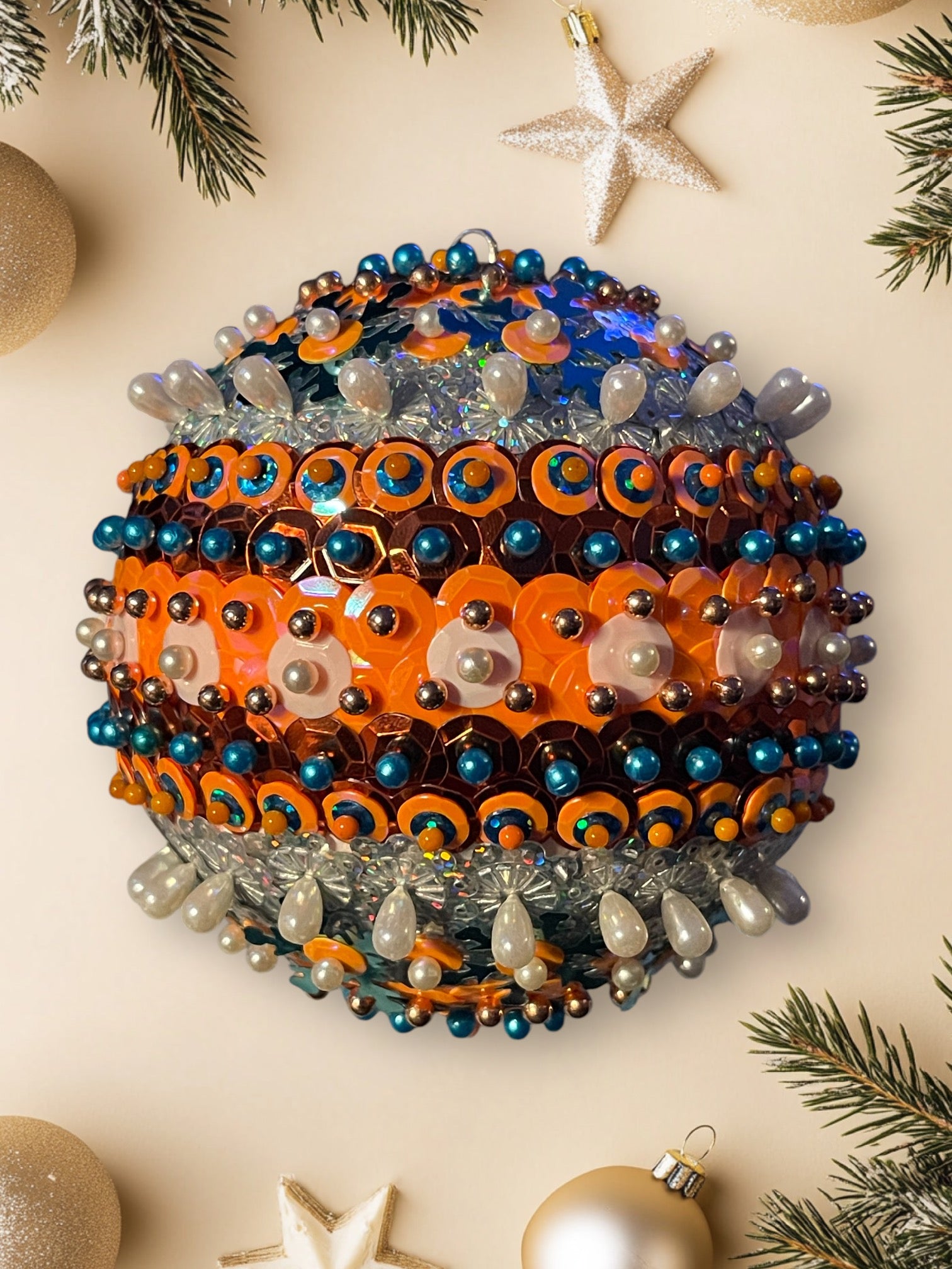 4” ornament with holographic, florescent and metallic orange, aqua/ teal and white festive ornament