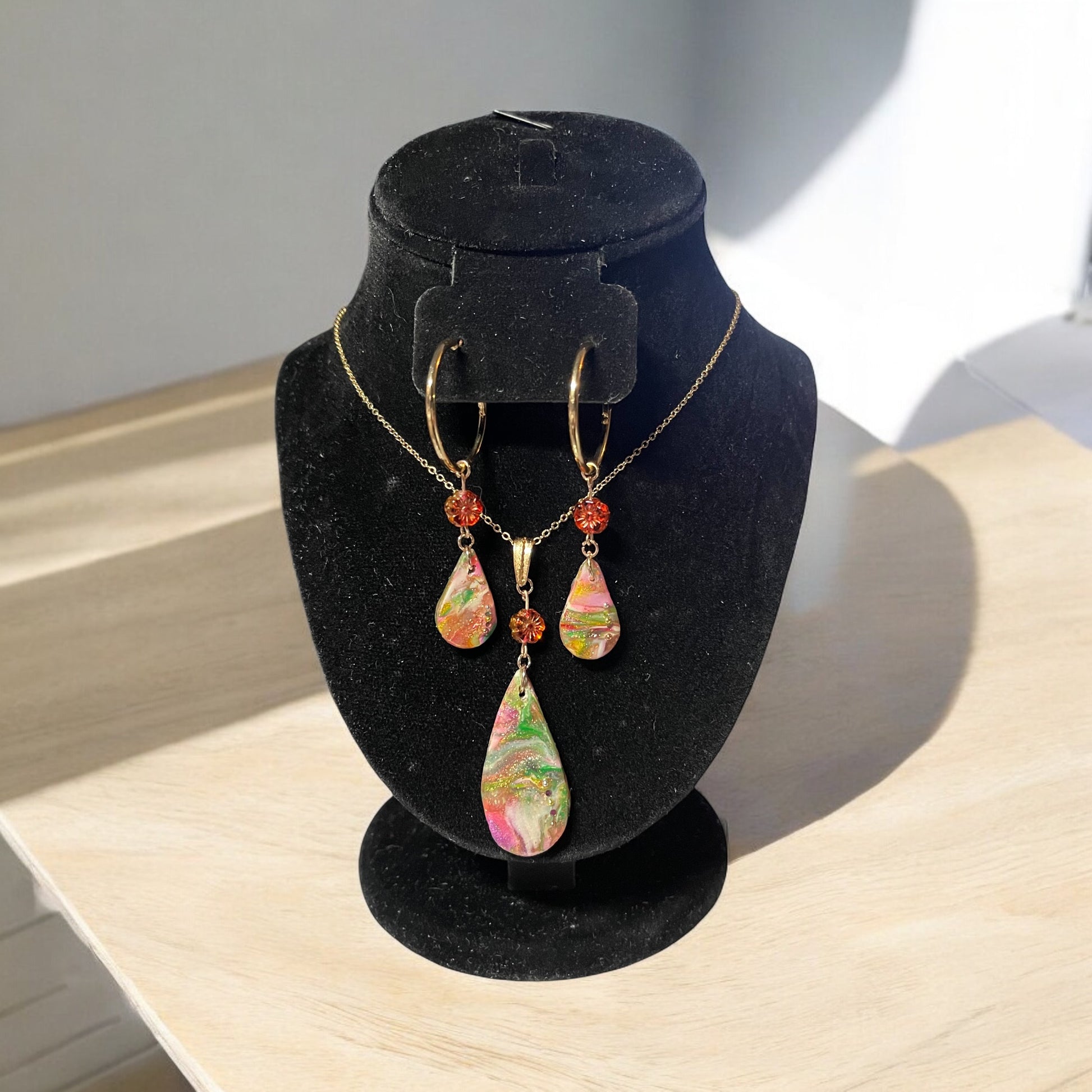 KC Gold 24” rolo tone chain with tutti fruity colored drop pendant and flower bead, kc gold hoops with marching tutti fruity colored drops and flower beads