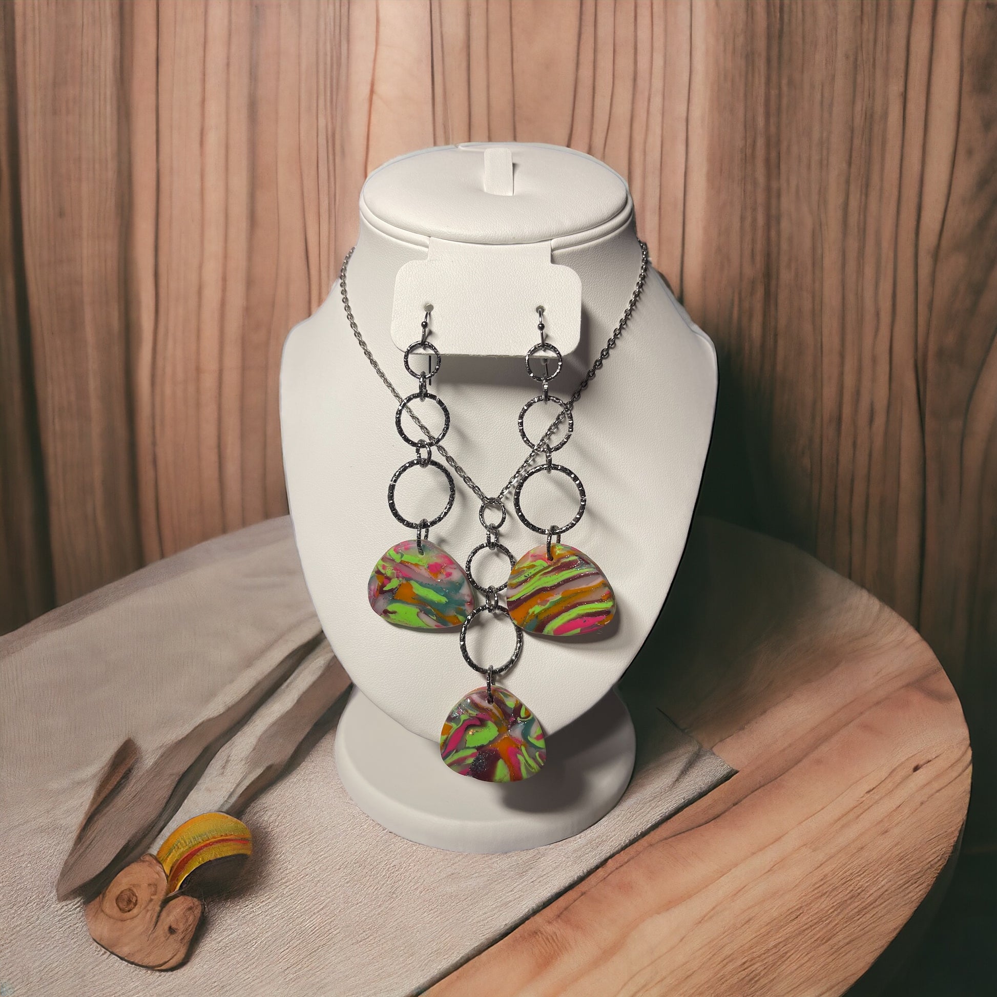 Neon swirl pendant with 24” gunmetal rolo chain and rings